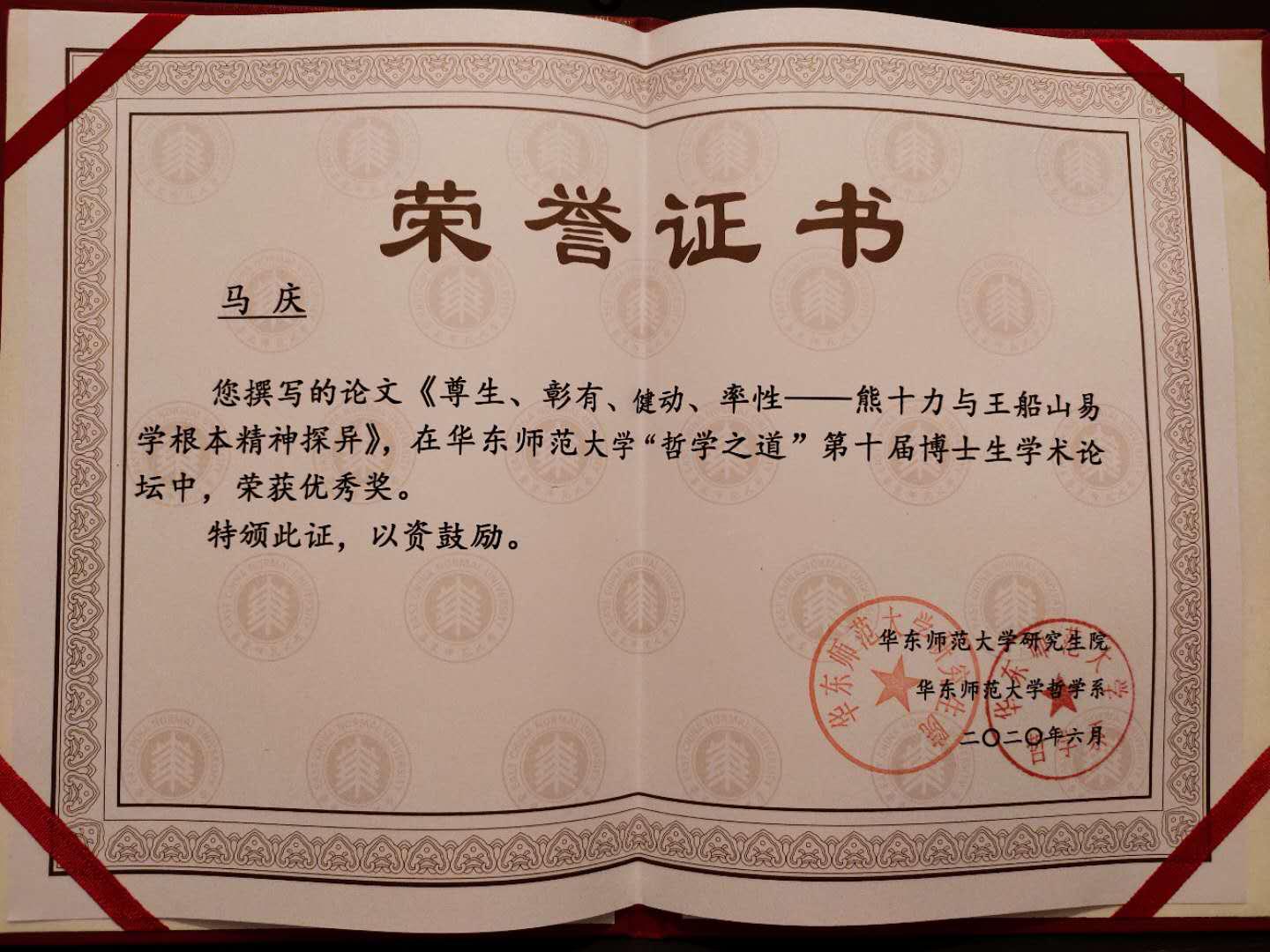 近日,华东师范大学研究生院主办,华东师范大学哲学系承办,《华东师范大学学报》(哲社版)编辑部和《思想与文化》杂志社协办的华东师范大学“哲学之道”第十届博士生学术论坛在云端(腾讯会议)顺利举行。手机看球中国哲学博士生马庆撰写的论文《尊生、彰有、健动、率性——熊十力与王船山易学根本精神探异》荣获优秀奖。