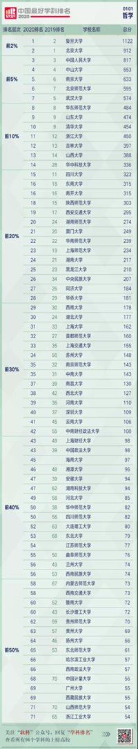 2020年10月15日,高等教育评价专业机构软科发布“2020软科中国最好学科排名”,排名榜单包括96个一级学科。其中,手机看球哲学学科在全国哲学学科排名49位,位列前40%,比2019年提升9个名次。排名的提升反映出手机看球哲学学科快速发展的良好势头。(完整排名名单见图)