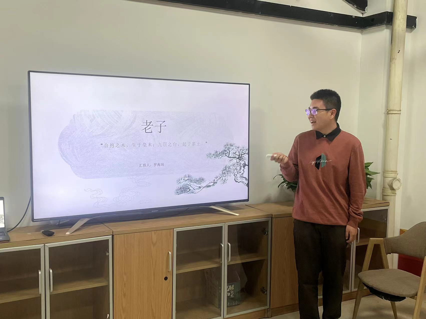 罗海瑞同学从“降牛出关”“智解水德”“孔子问礼”等小故事入手,对老子生平、思想、轶事,及《道德经》进行了生动讲解。